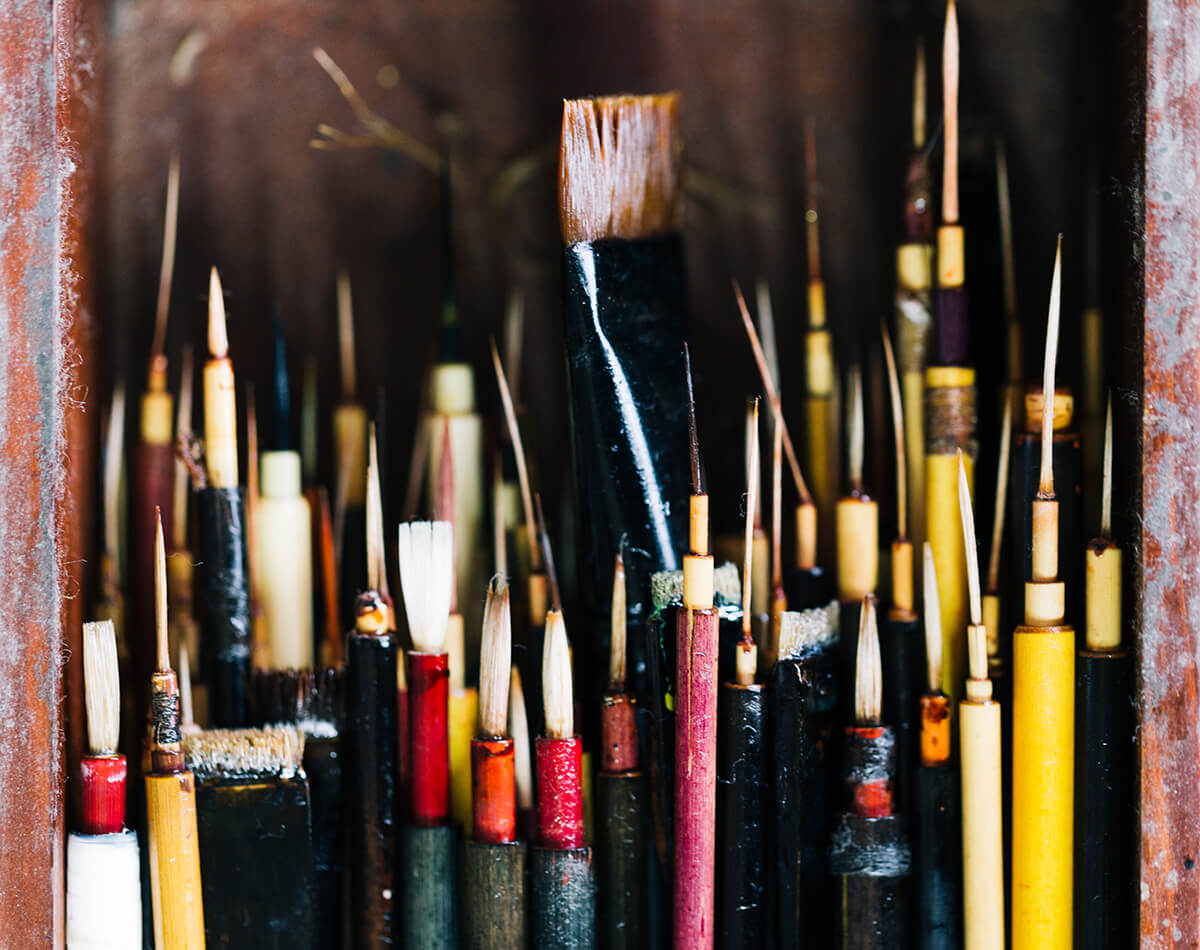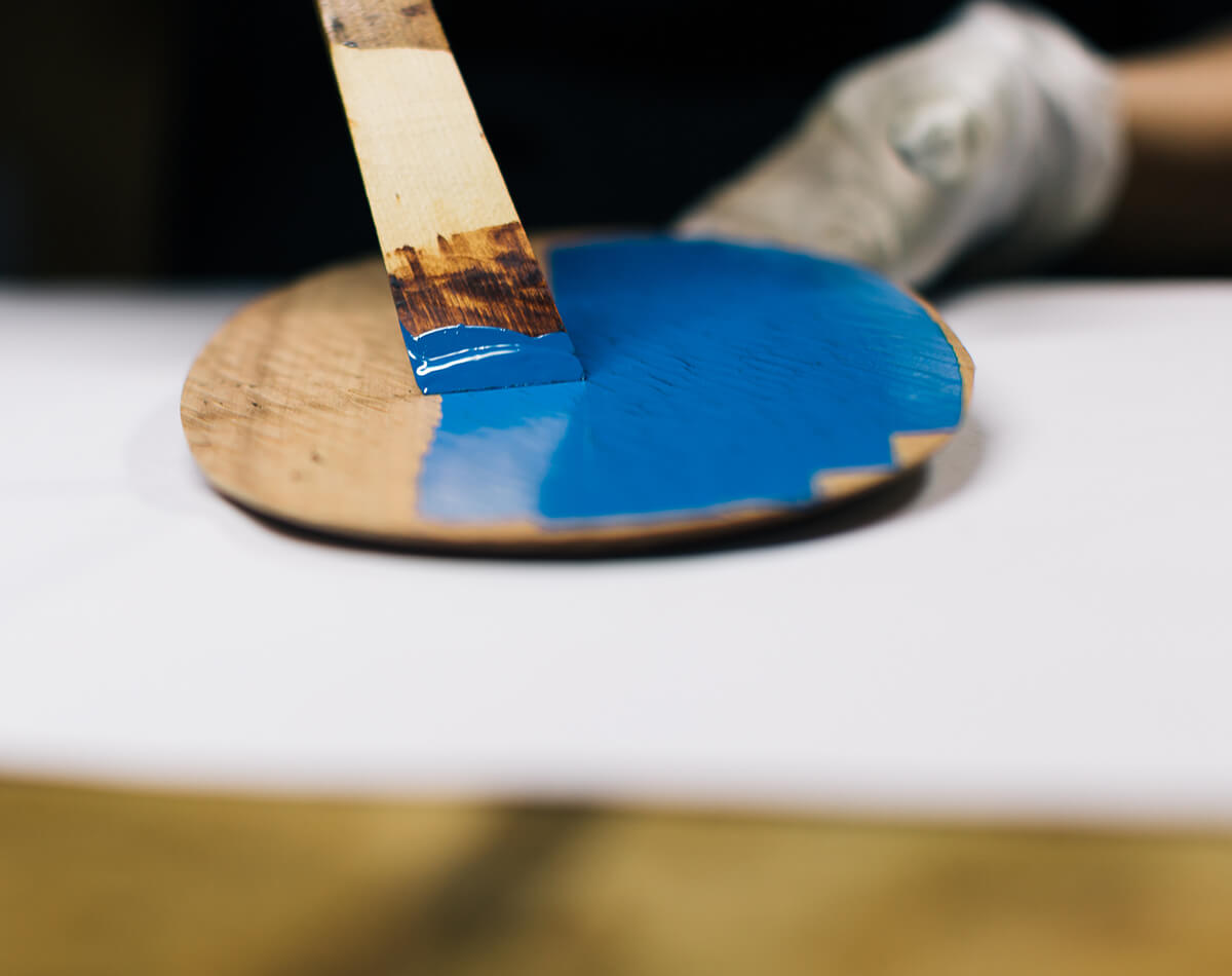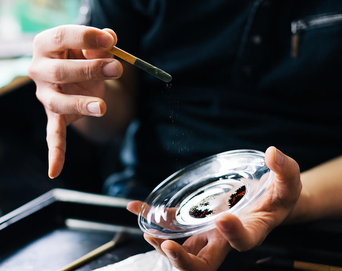 ほこりや塵をいっさい排除した衛生的な環境と、温度と湿度の両方を徹底的に管理された工房空間にて、塗りと乾燥の工程を繰り返していきます。表面に塗りムラを残すことなく、均一な厚さで漆を塗っていくのには、熟練された繊細な技術が必要。模様のない無地の器であれば、上塗りが終わった時点で、商品は完成となります。