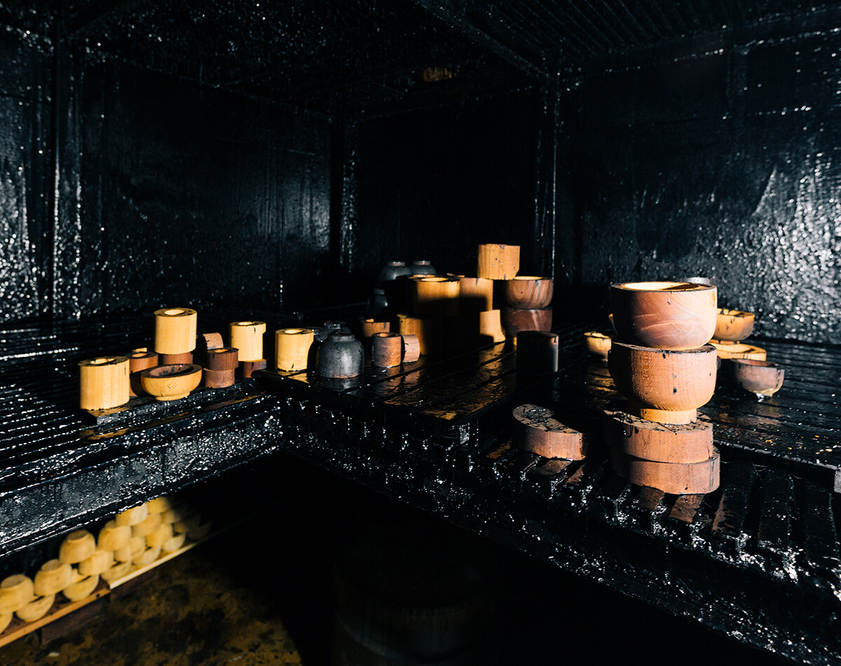 1本の丸太を削ることで「荒型」と呼ばれる状態にし、そこから1年以上の自然乾燥の期間を経て、さらにオーダーされたカタチへと削り出していきます。五感すべてを研ぎ澄まして仕上げていくその姿は、まさに木地職人のものづくりへの魂が映し出されたもの。最終的には光にかざせば木の繊維が透けて見えるまでに薄く削ることで、「椀木地」と呼ばれるベースのカタチが出来上がります。